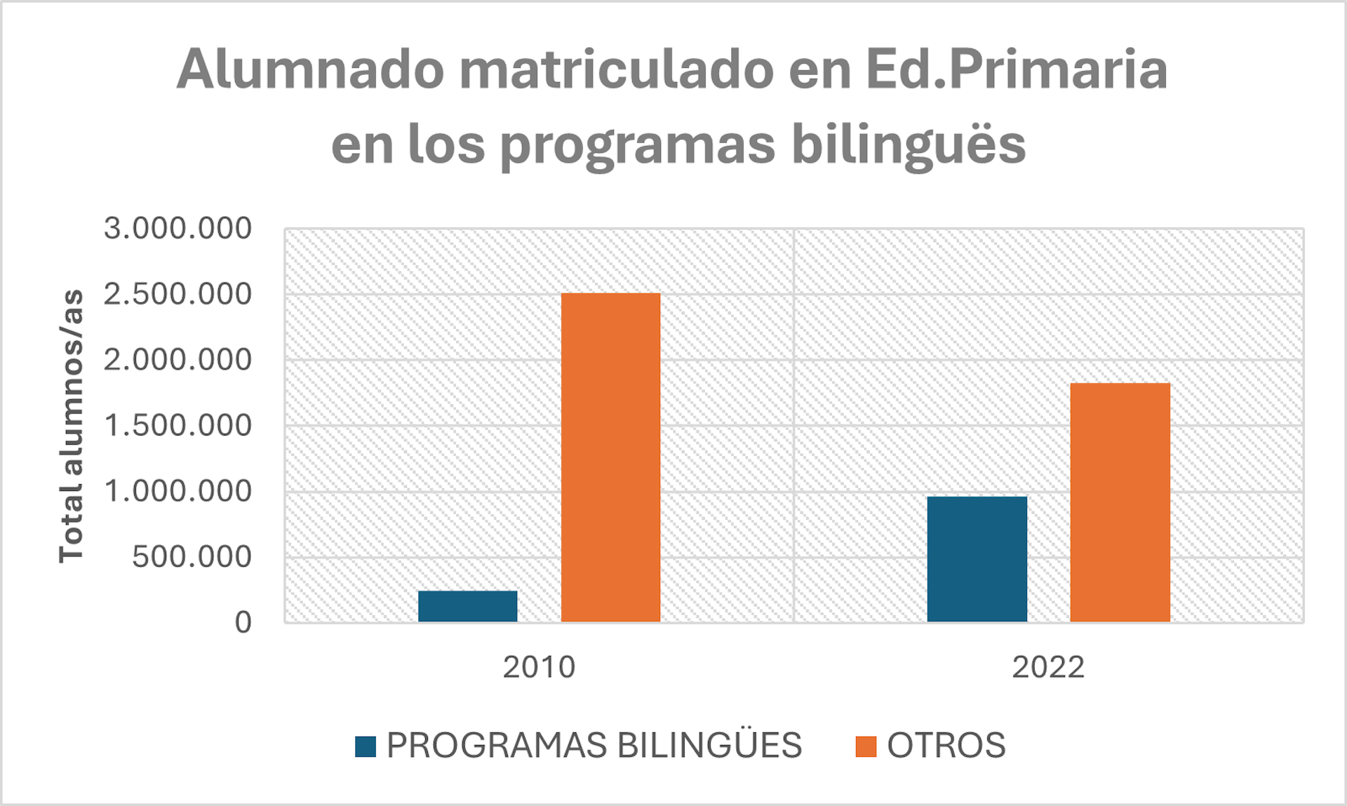 Evolución de los alumnos matriculados en Educación Primaria en los programas bilingües en España (Ministerio de Educación, Formación Profesional y Deportes, 2024).