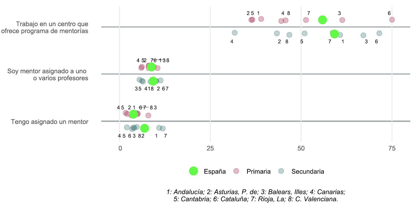 En países como Australia, Bulgaria, Islandia, Nueva Zelanda o Suecia, por ejemplo, el porcentaje de docentes que trabaja en un centro que dispone de este tipo de programas es, como mínimo, del 96 %. En cambio la mentoría aún no se ha consolidado como práctica habitual en el desarrollo profesional en España, que es uno de los países con menor presencia de este tipo de programas.